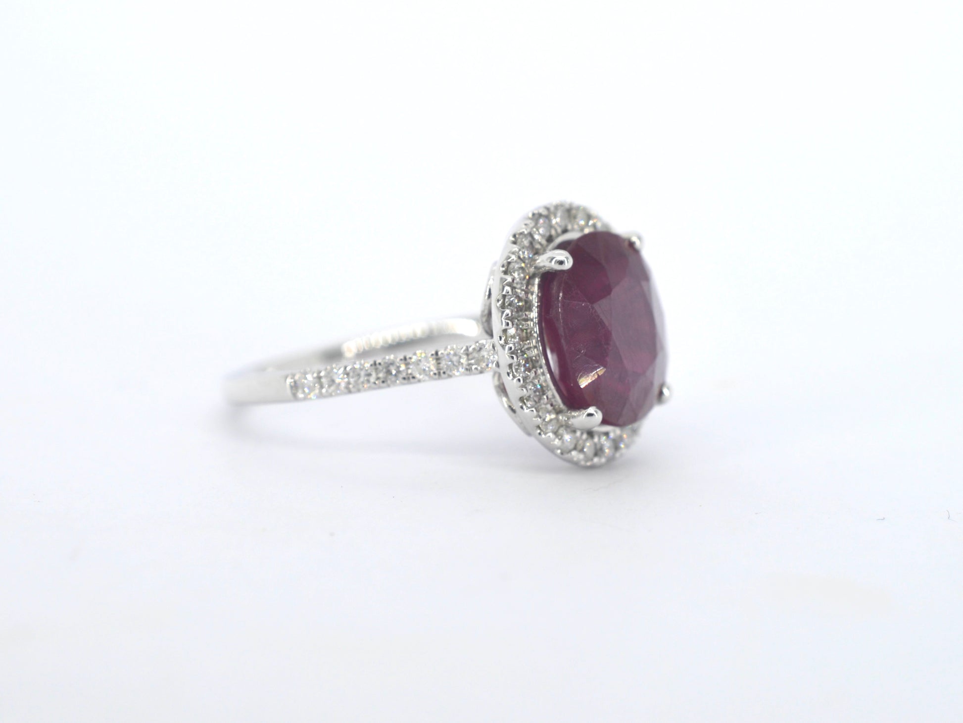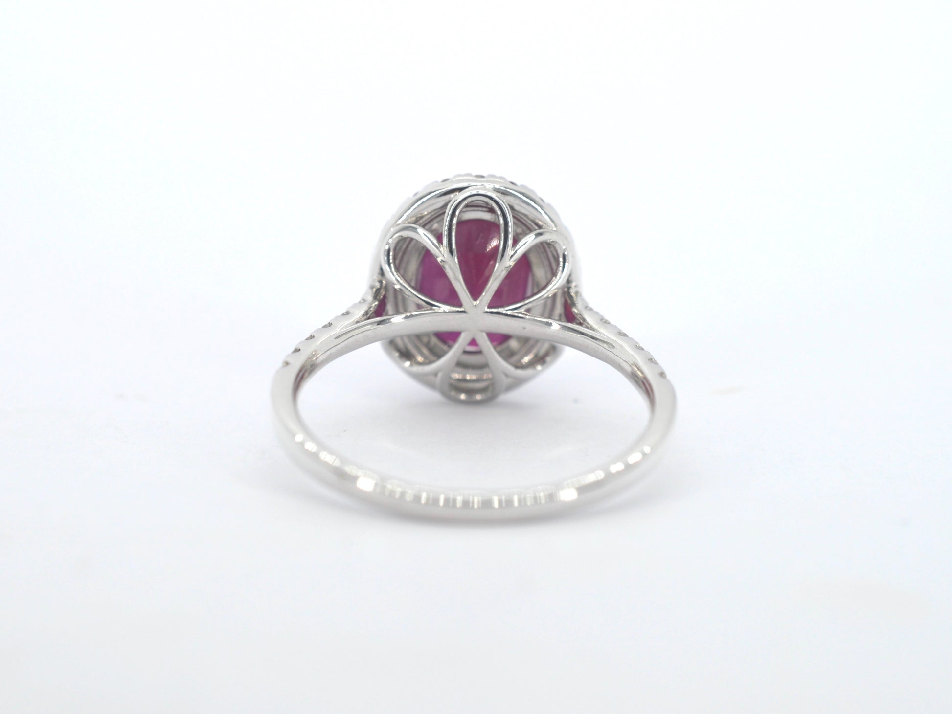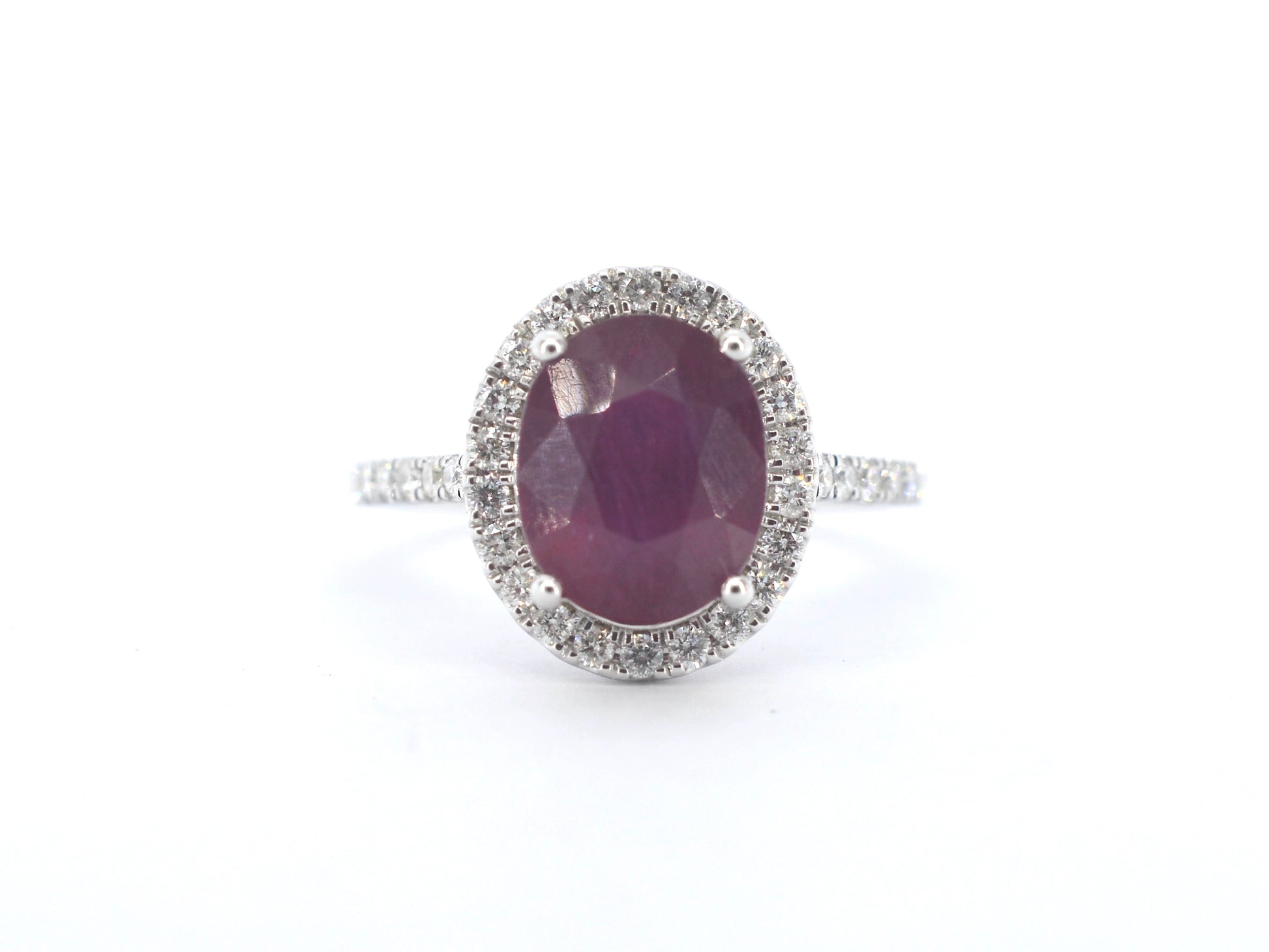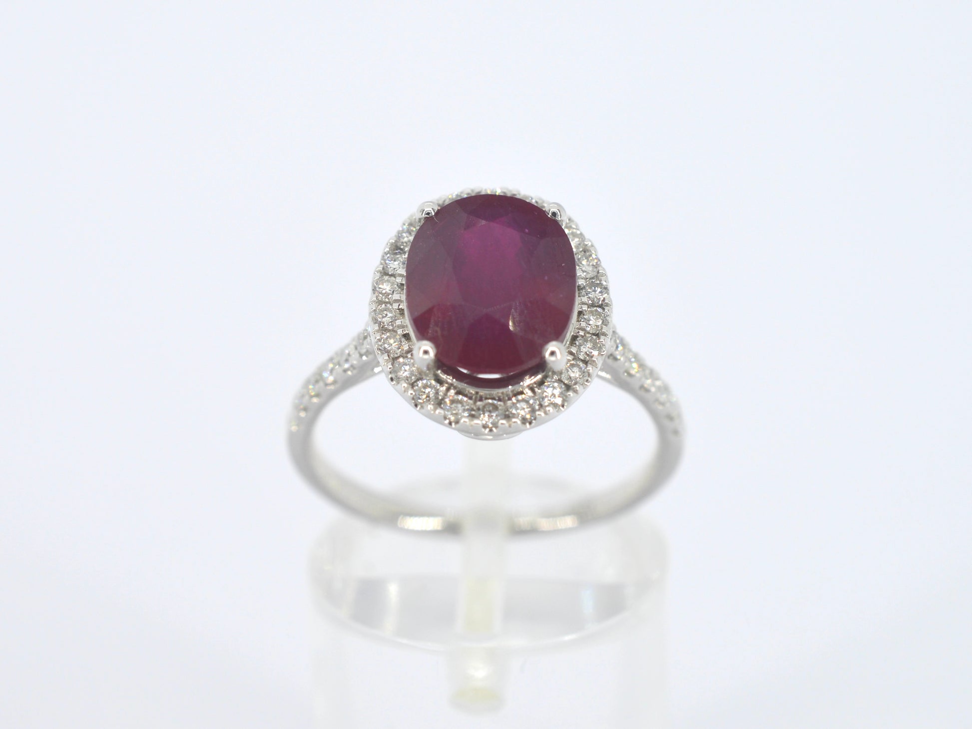 Witgouden entourage ring met diamanten en robijn