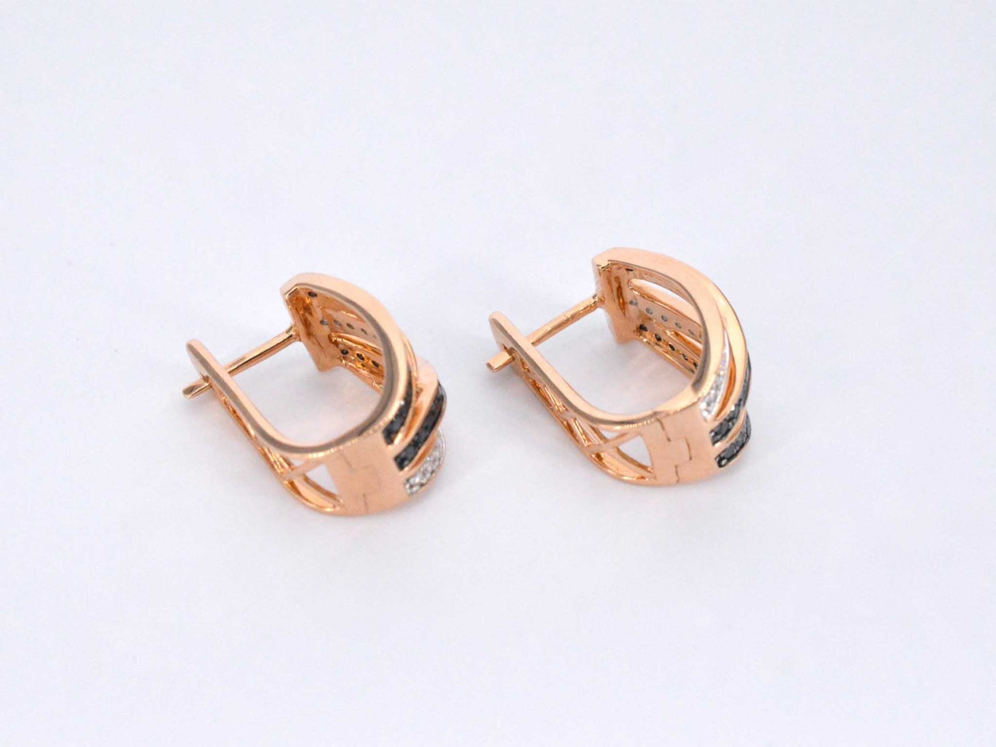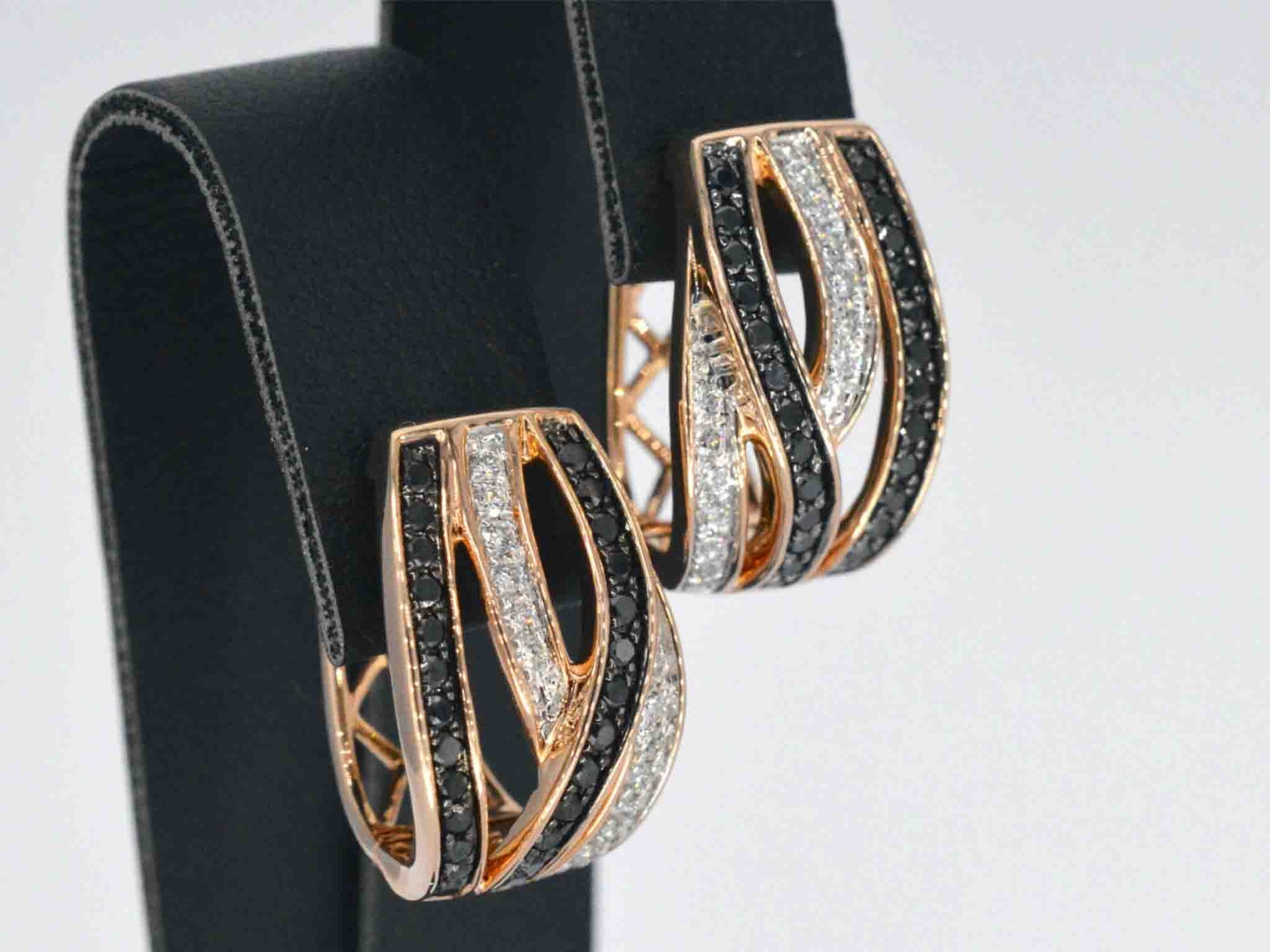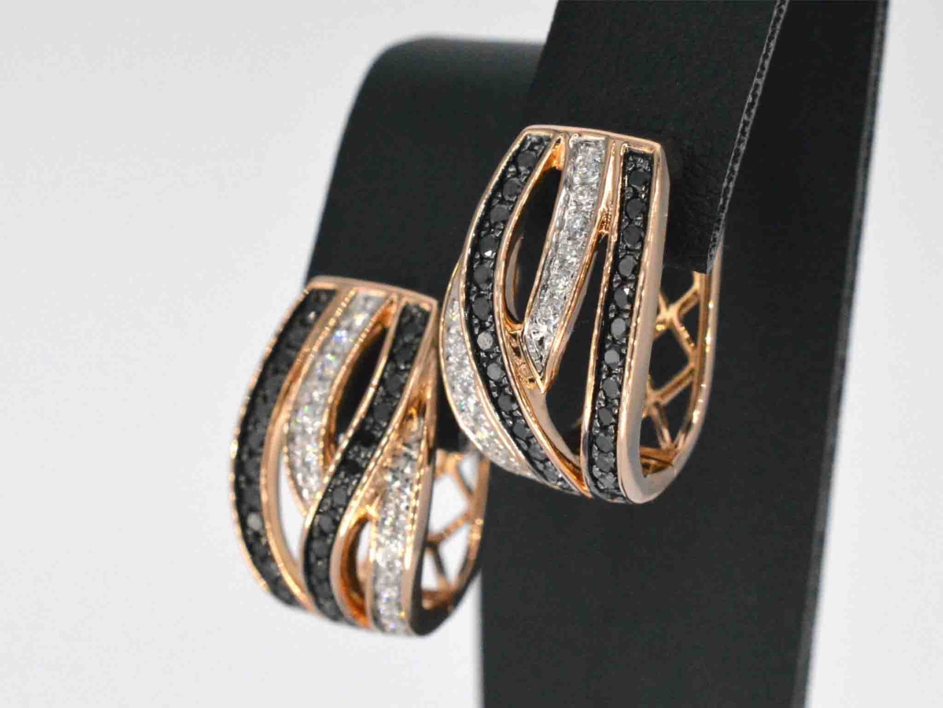 Rose gold designer earrings with white and black brilliant cut diamonds