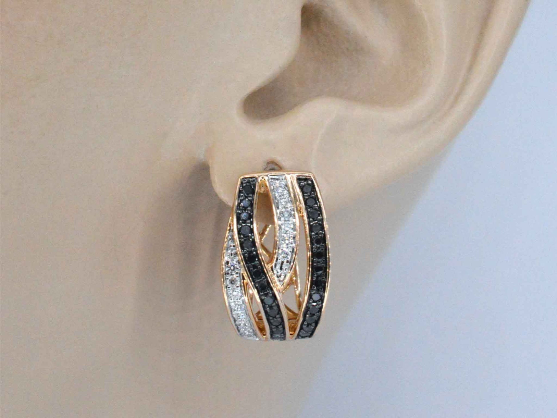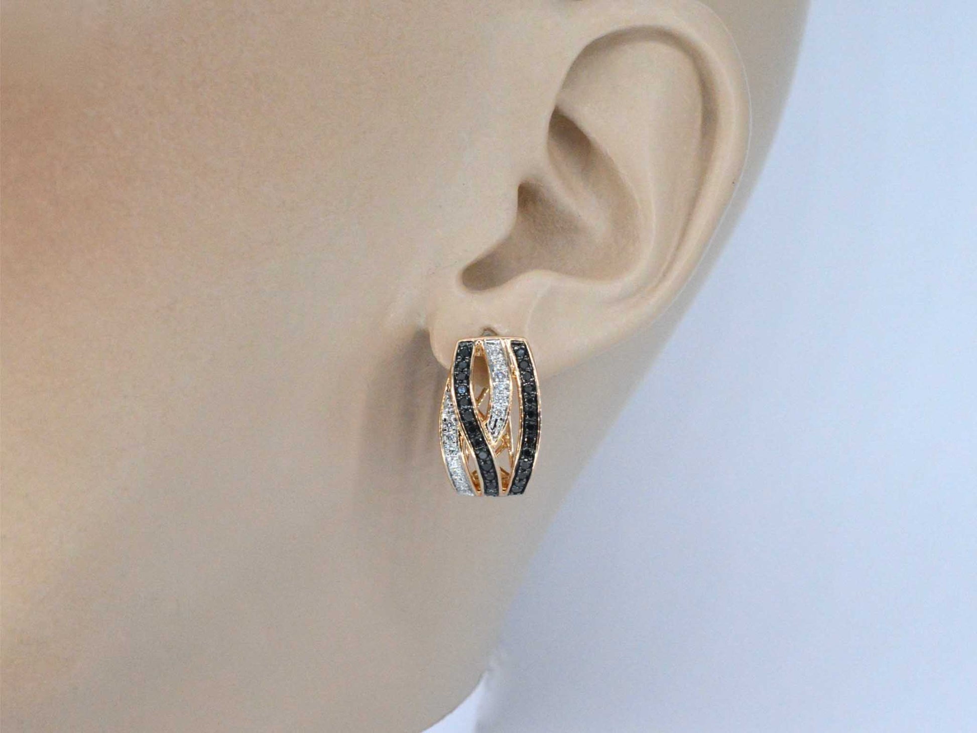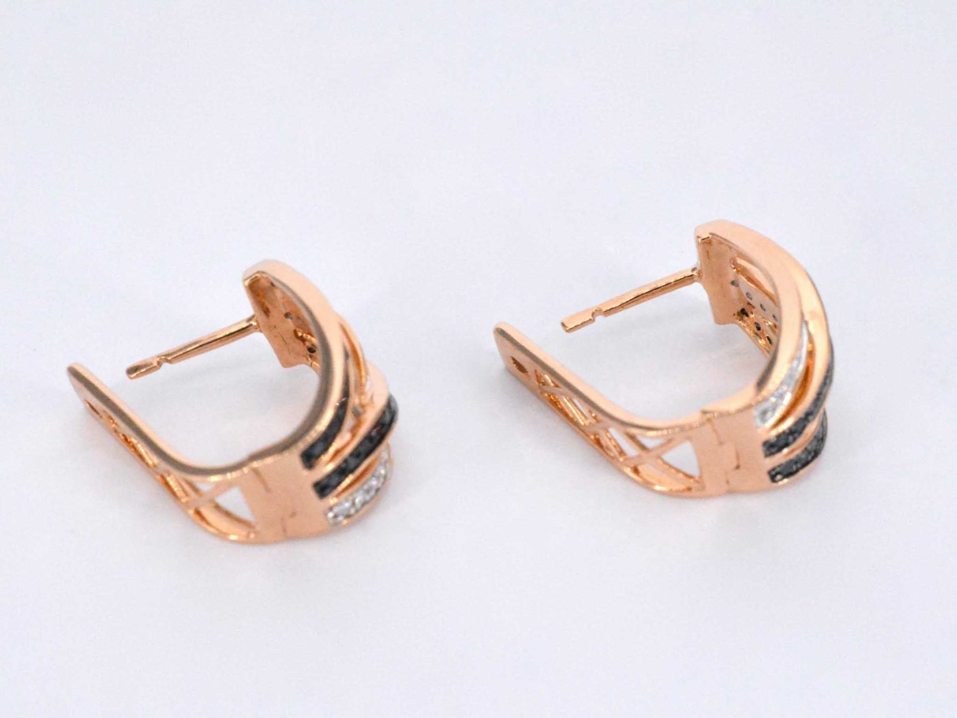 Rose gold designer earrings with white and black brilliant cut diamonds