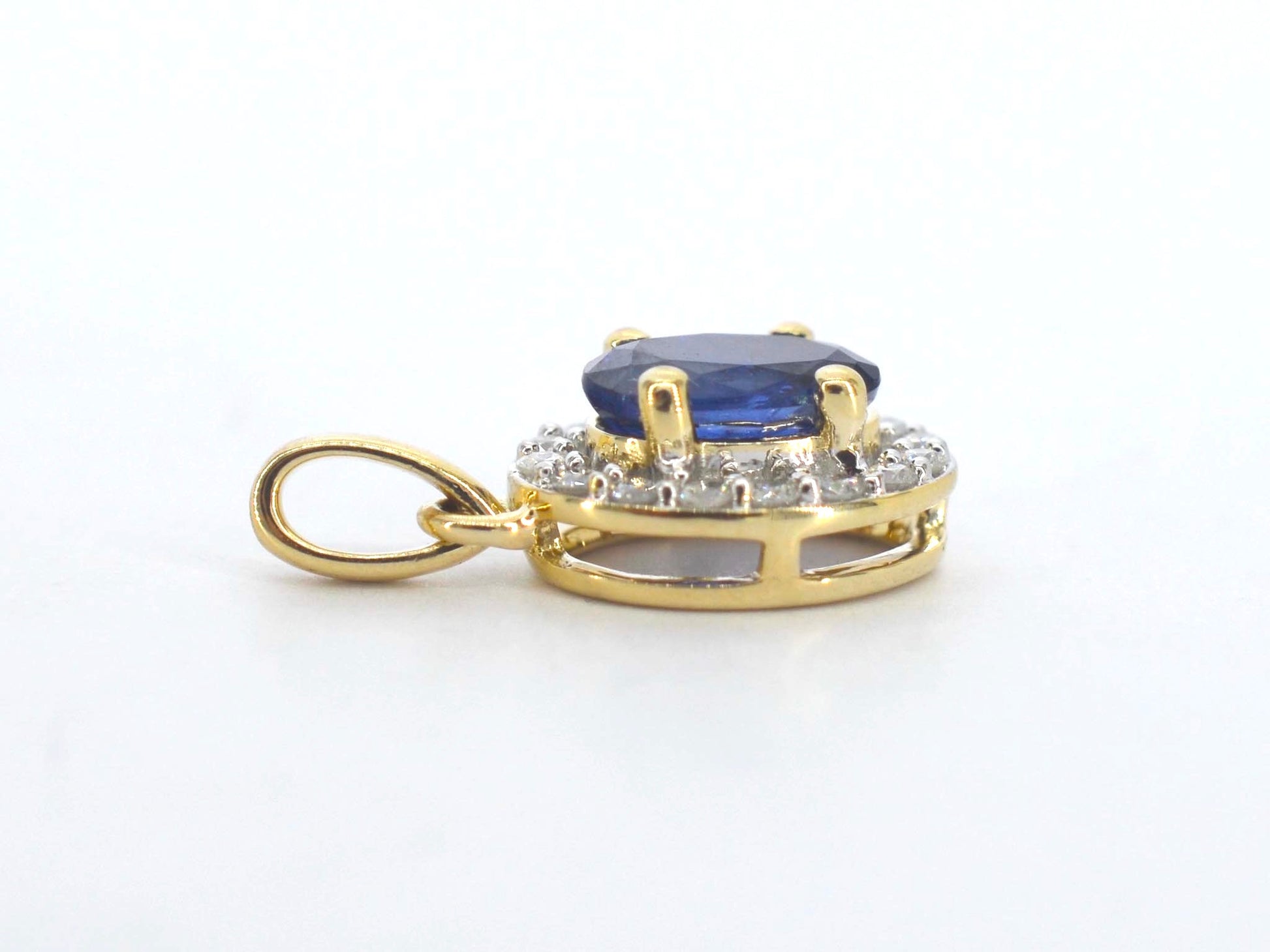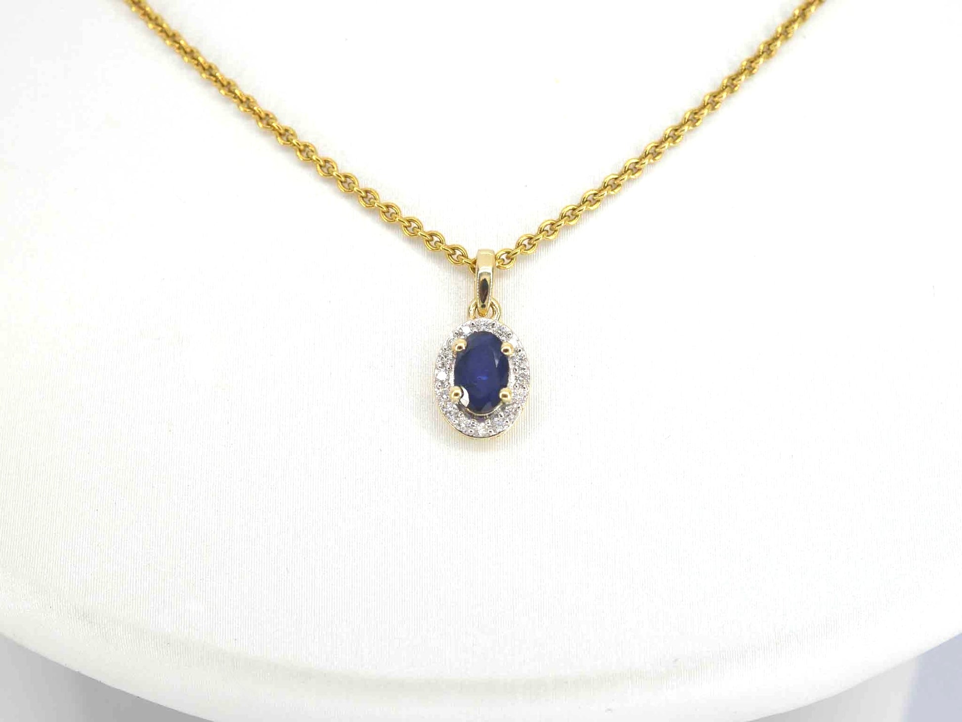 Gouden entourage hanger met diamanten en saffier