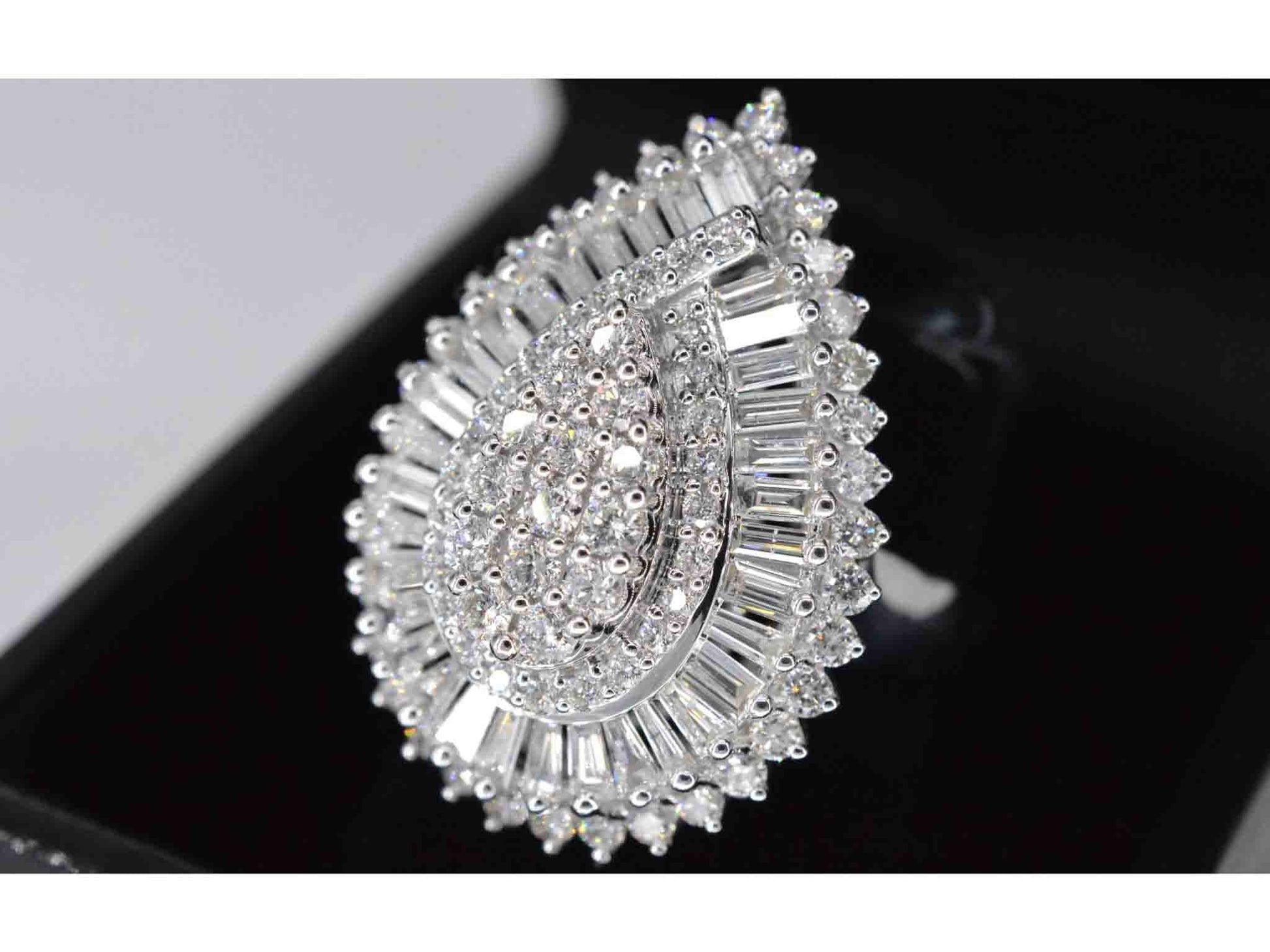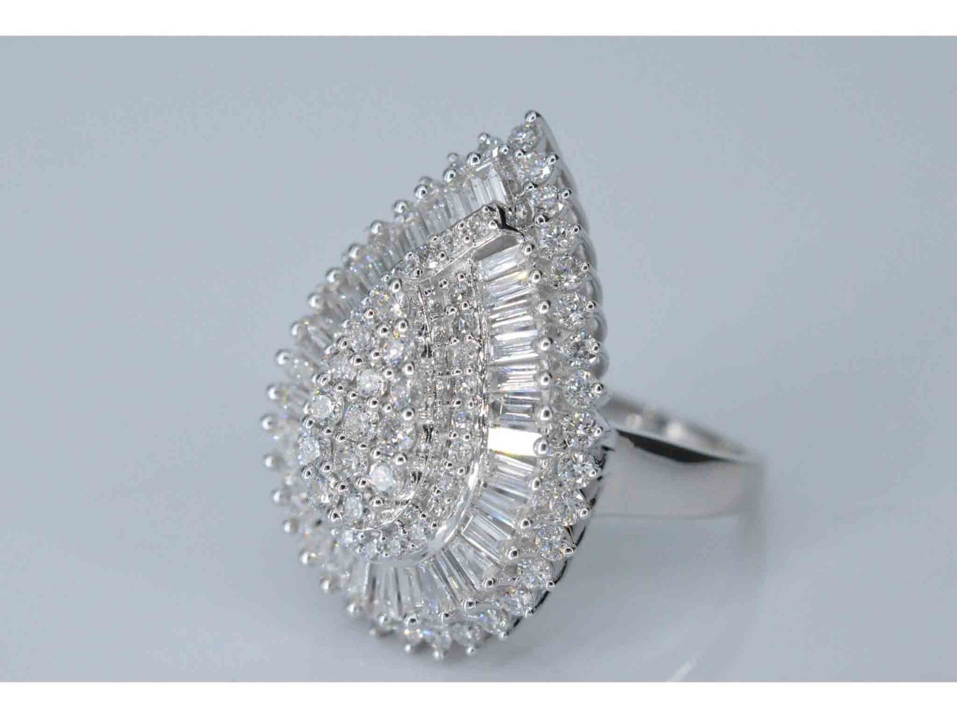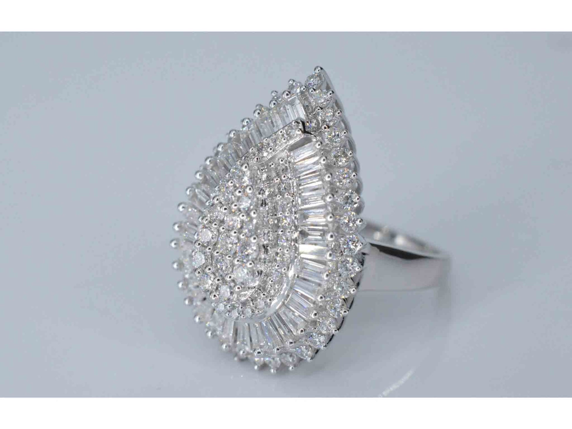 Exclusieve witgouden druppelvormige entourage ring met diamanten
