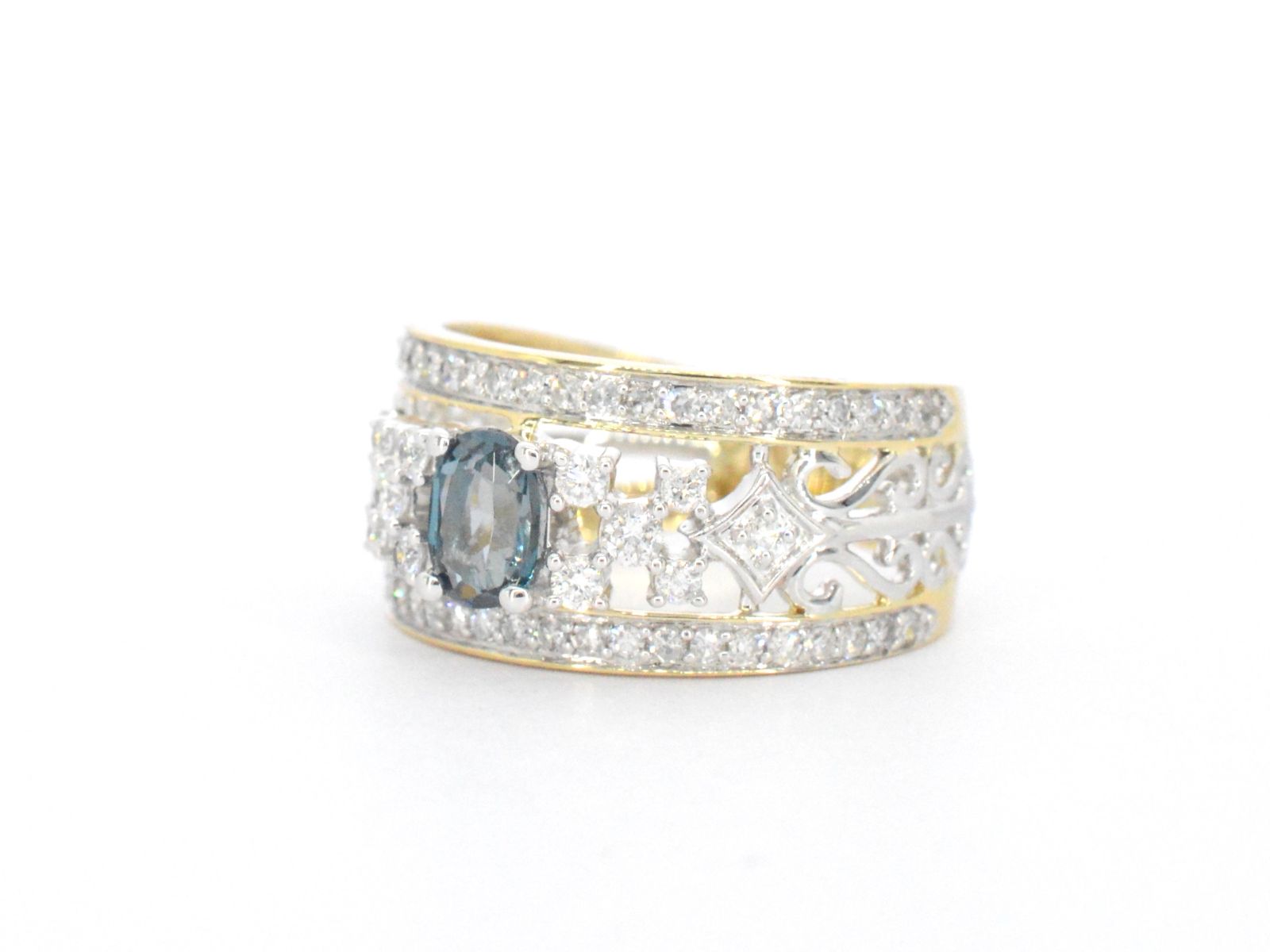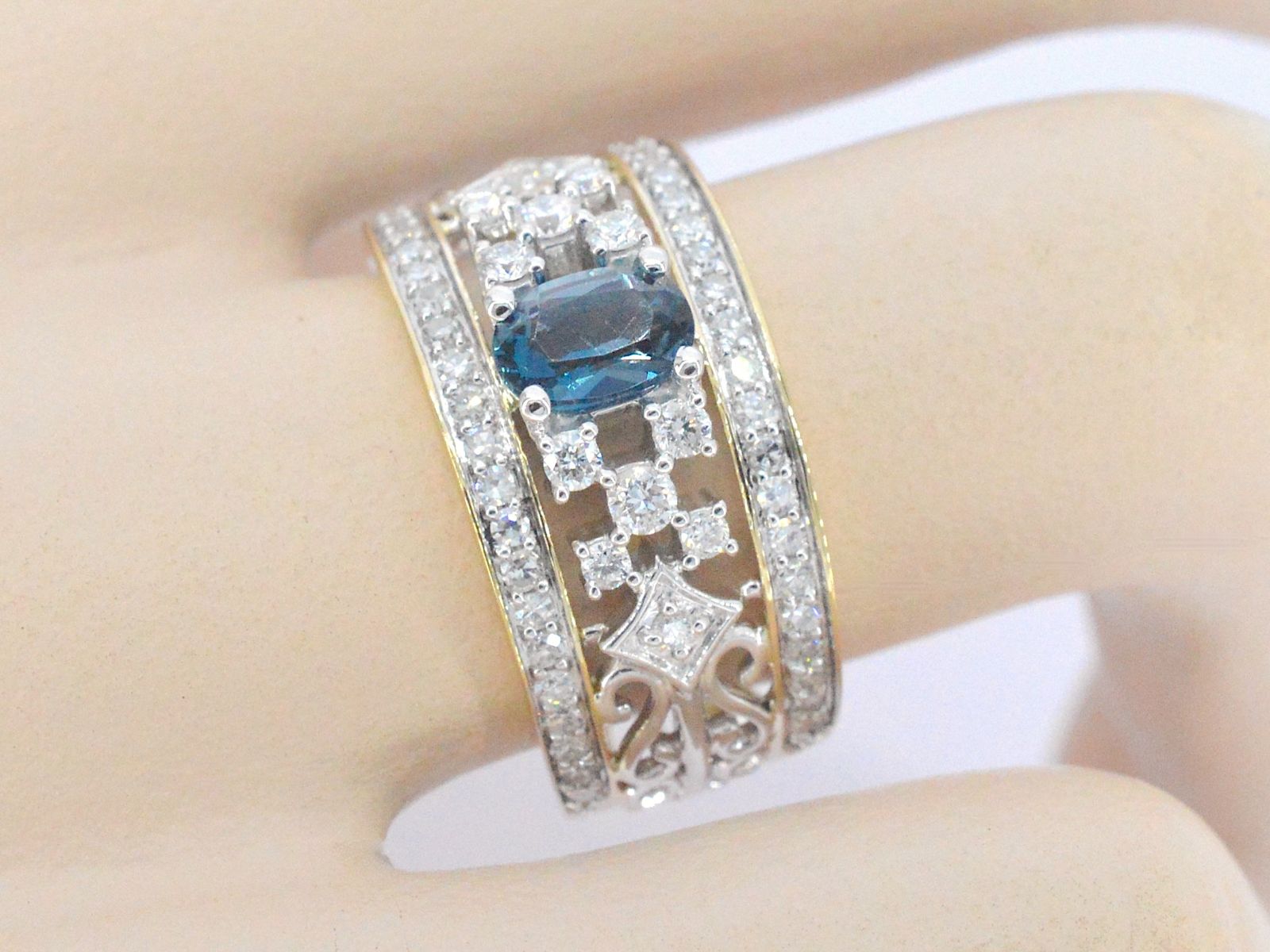 Gouden exclusieve ring vol met diamanten en een edelsteen