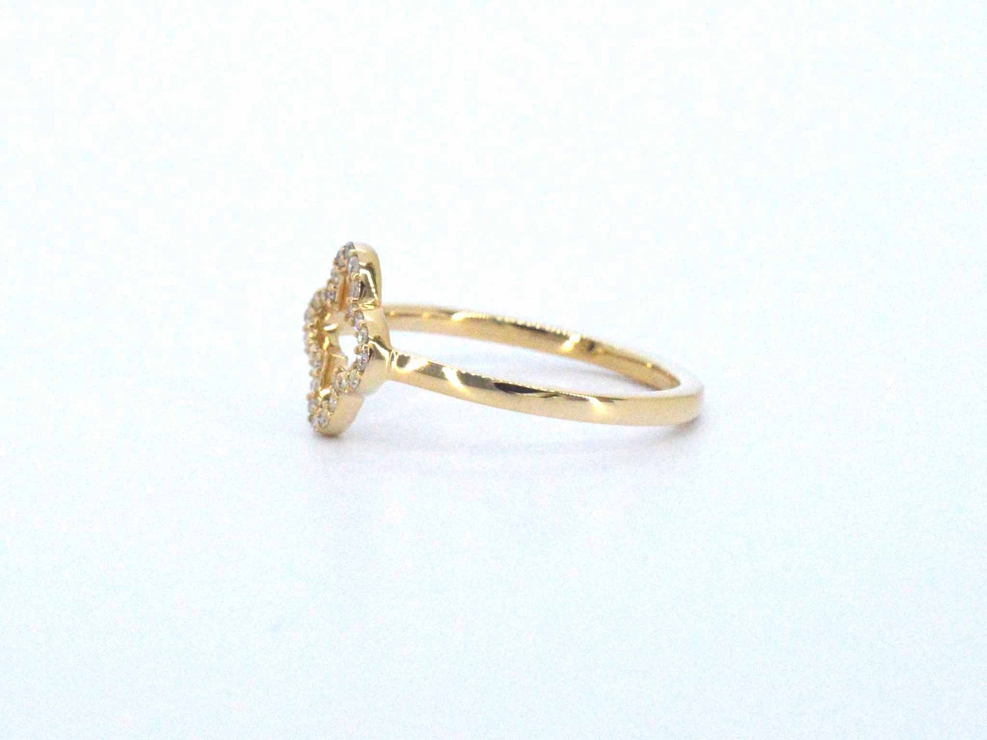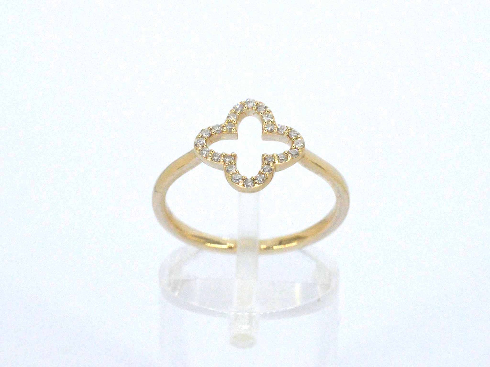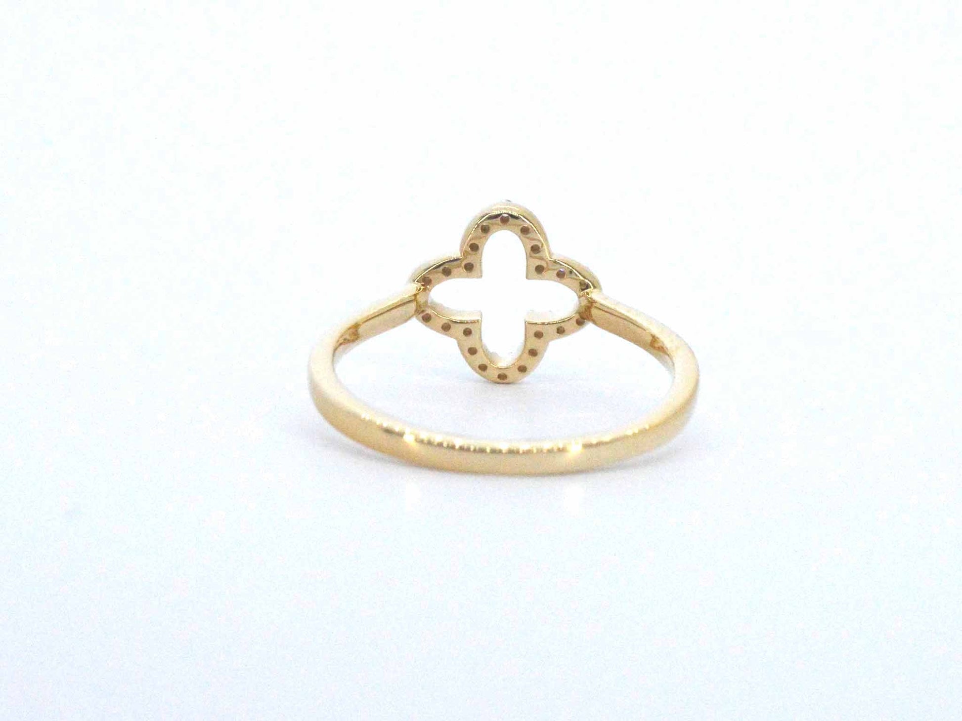 Gouden ring met een open klaver vier motief gezet met diamanten