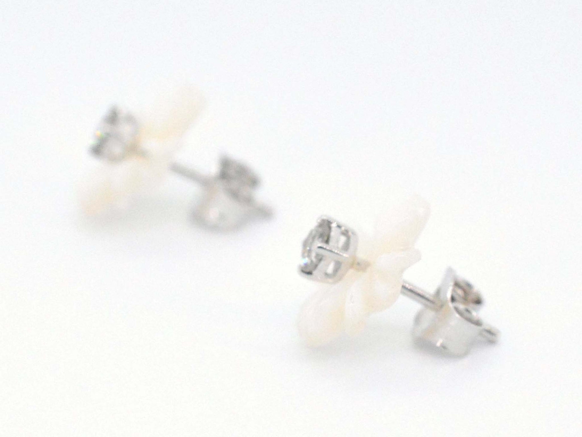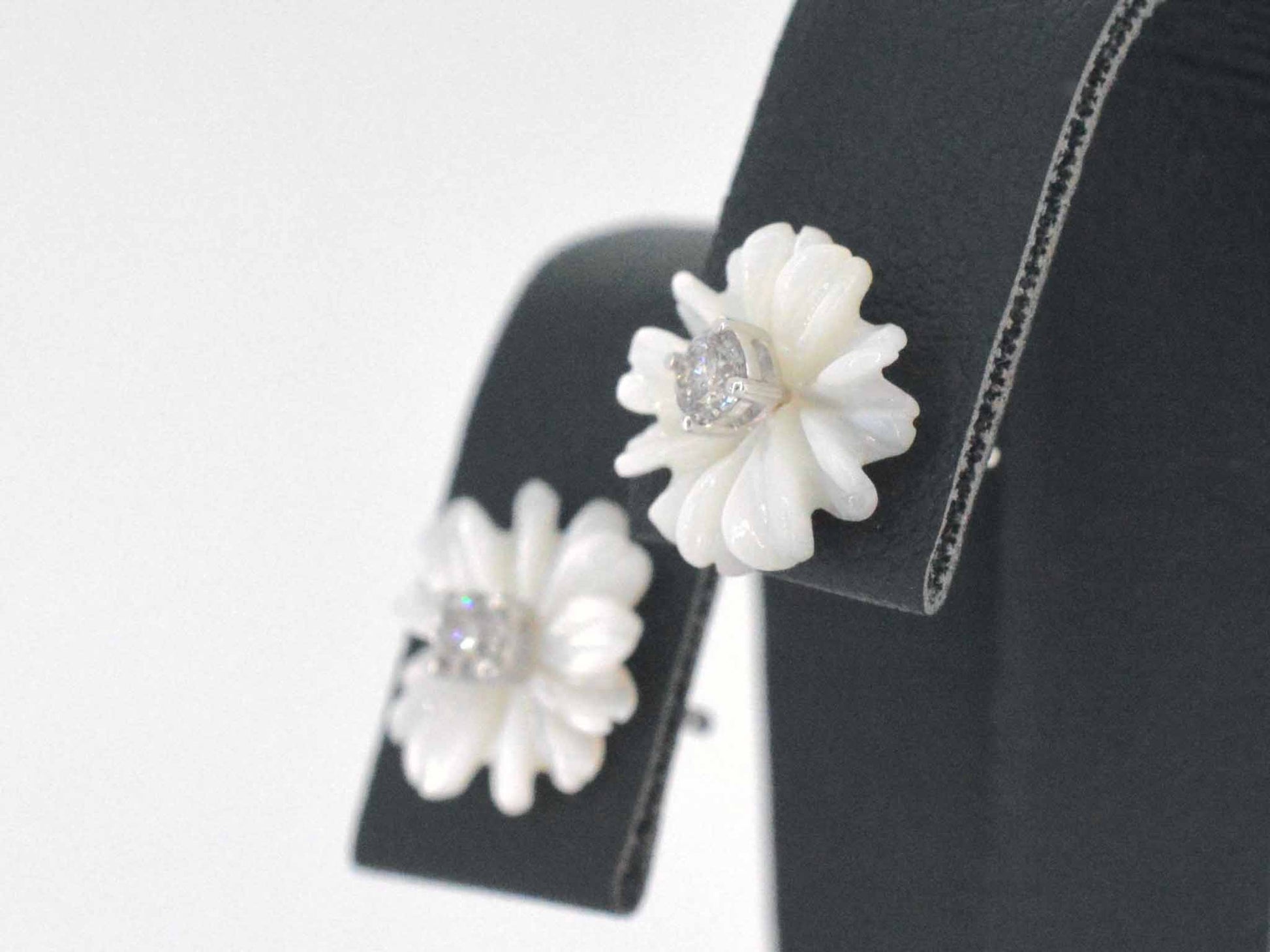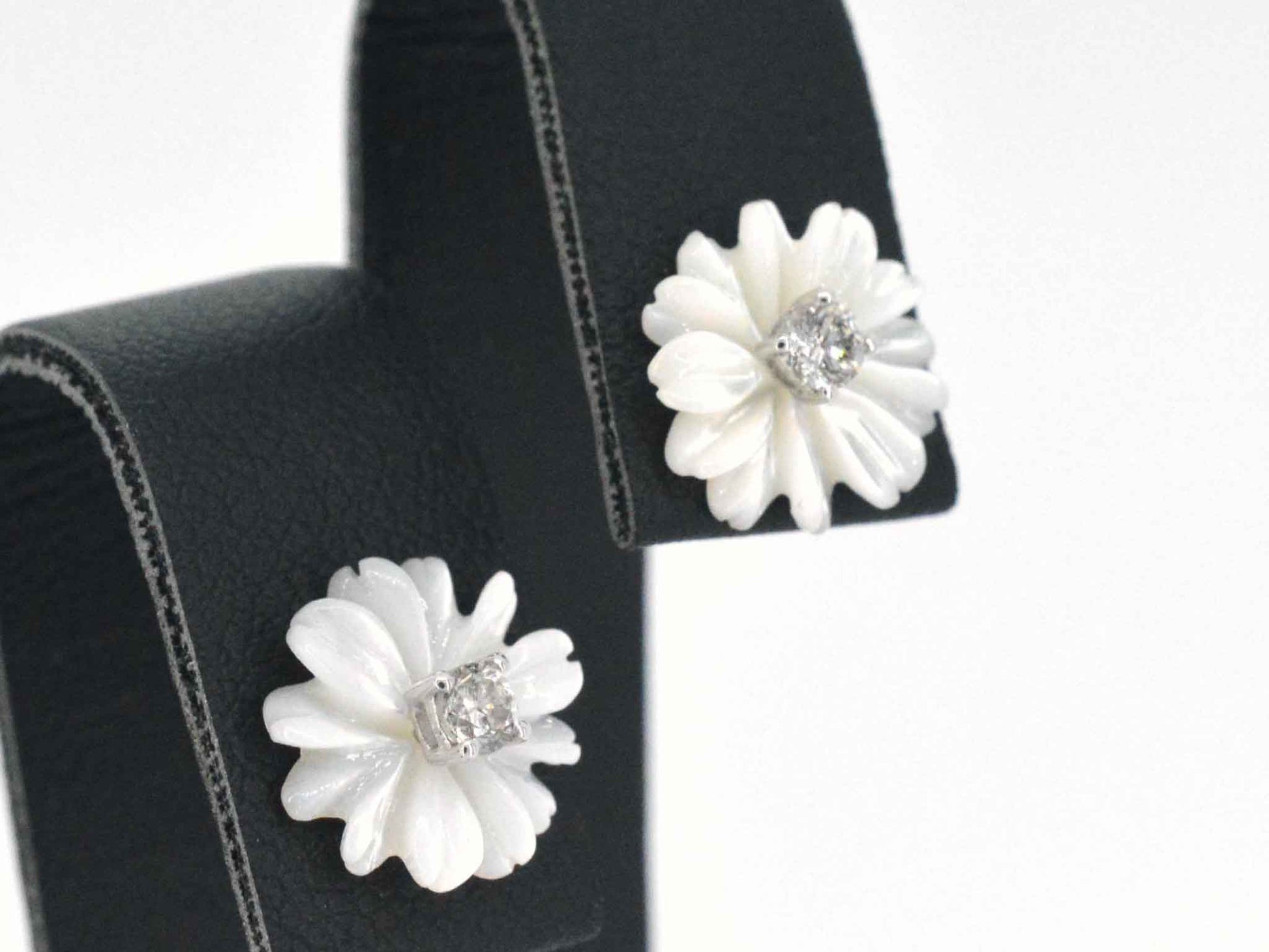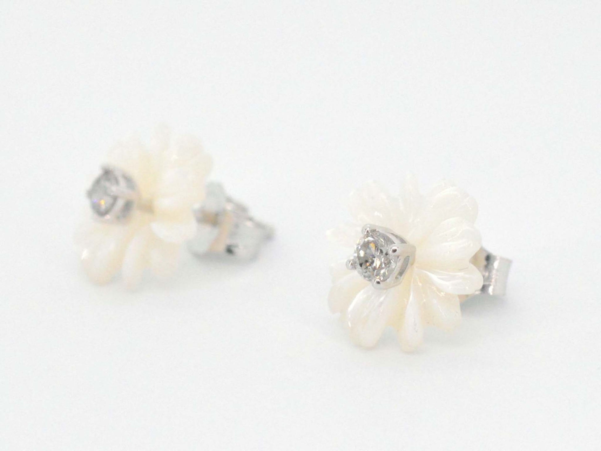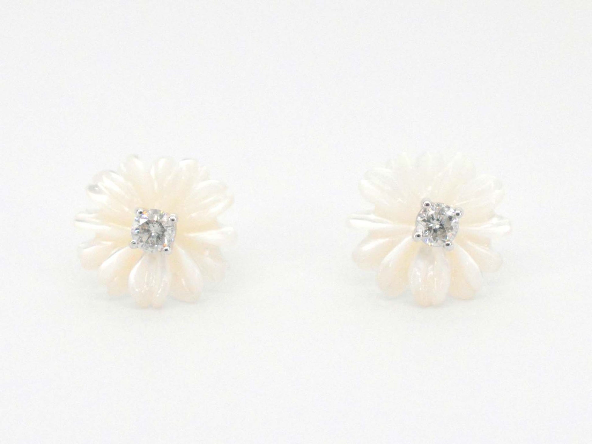 Witgouden oorbellen met 0.18 carat diamanten en parelmoer edele bloem