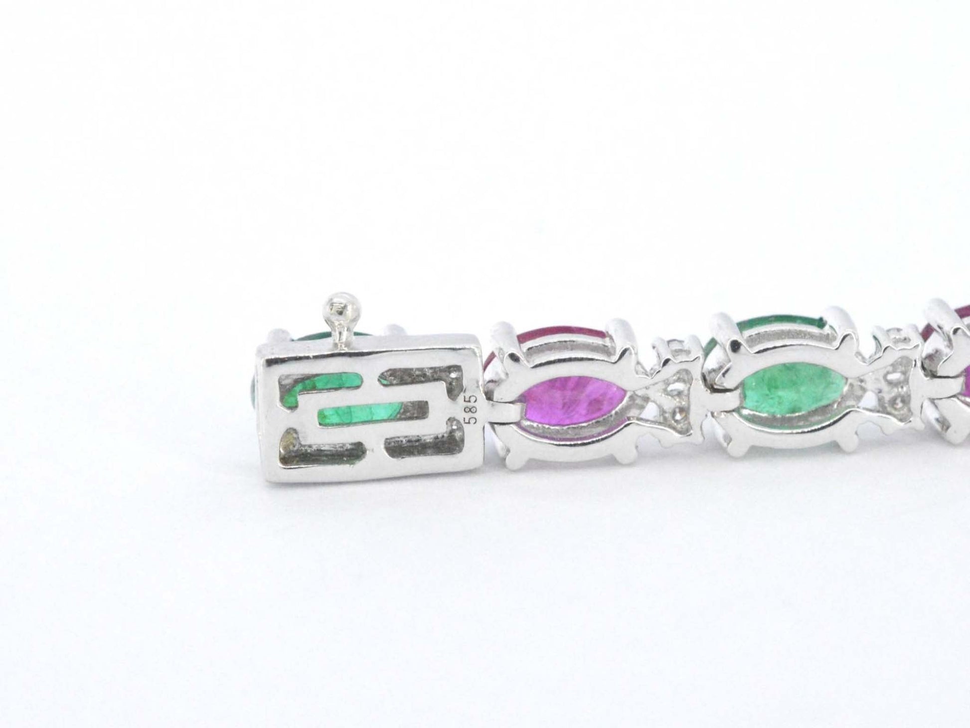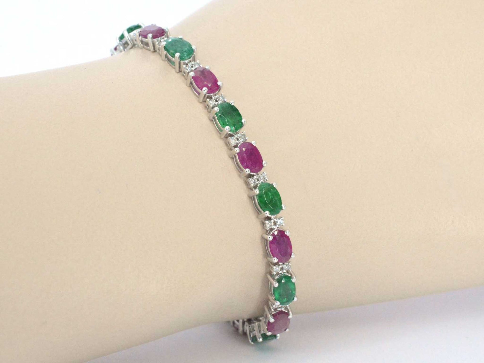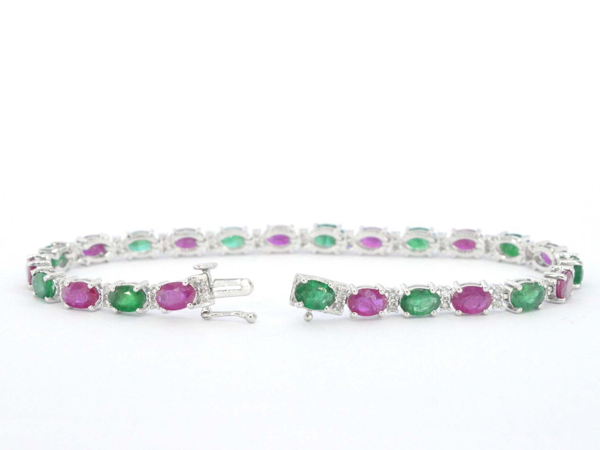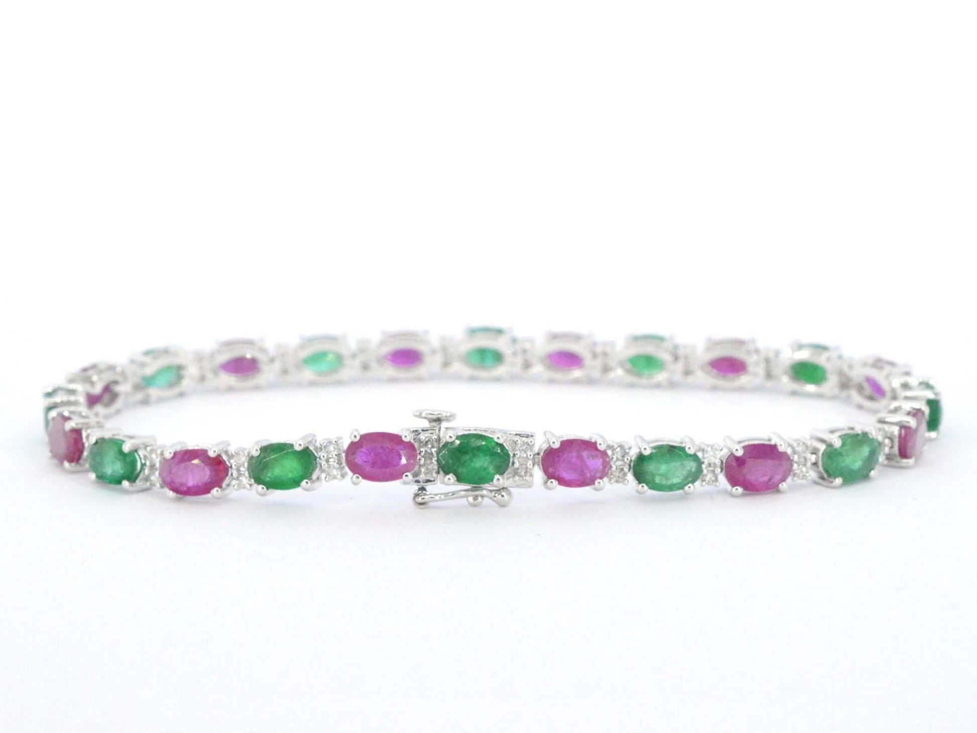 Witgouden tennisarmband met diamanten en smaragd en robijn